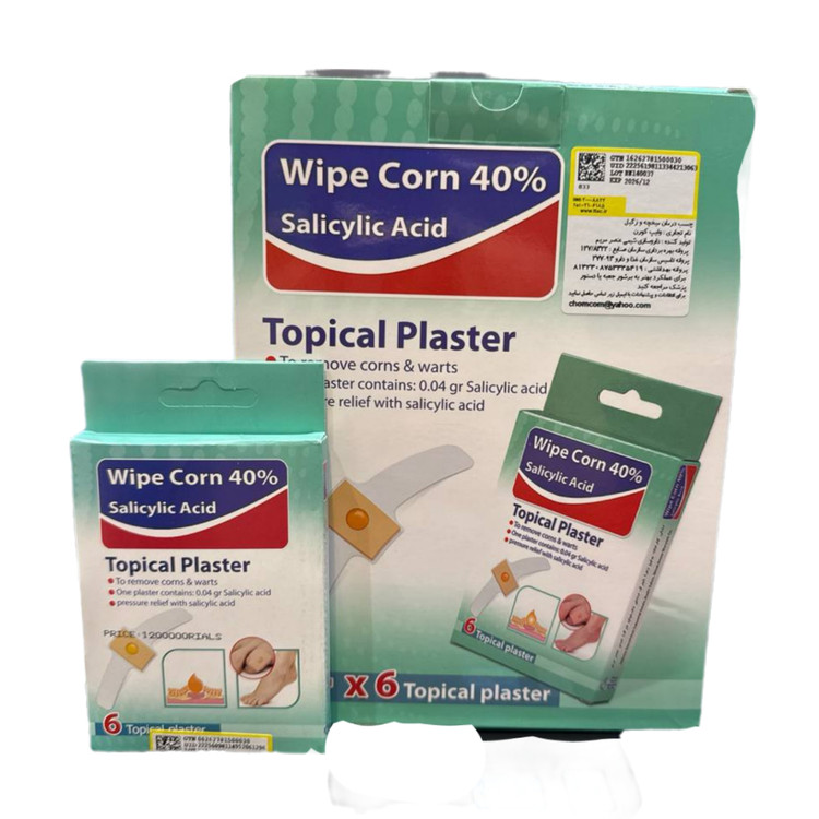 چسب میخچه وایپ کورن 40 درصد 6 عددی Wipe Corn Topical Plaster 40% 6pcs، پس از مدتی استفاده از آن ، مشکل میخچه پا را برطرف خواهد کرد. این چسب حاوی 40 درصد اسید سالسیلیک است که بعد از انجام آزمایش های فراوان و با توجه به اینکه غلظت این اسید باید به گونه ای باشد که هم بتواند میخچه و زگیل را درمان کند و هم به پوست نواحی سالم آسیبی نزند تعیین شده است.این چسب دارای یک پد تو خالی دایره ای شکل است که دور میخچه قرار می گیرد تا آن را محصور کرده سپس اسید به آرامی از داخل پد آزاد شده و میخچه را تحت تاثیر قرار می دهد.